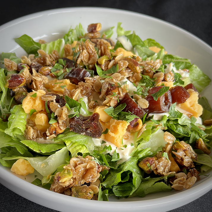 Romaine Salad with Cheddar Vinaigrette and Pistachio Granola (GF, Veg)